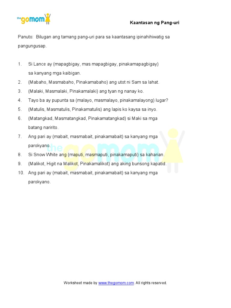 Source: www.thegomom.com Worksheets are pagsasanay sa filipino, pagsasanay sa filipino, kaantasan ng pan. To download this file, please click here.